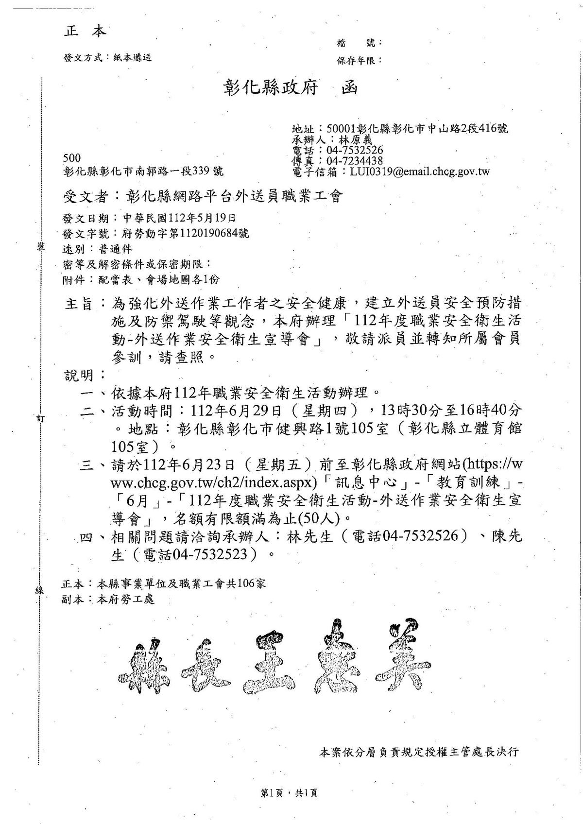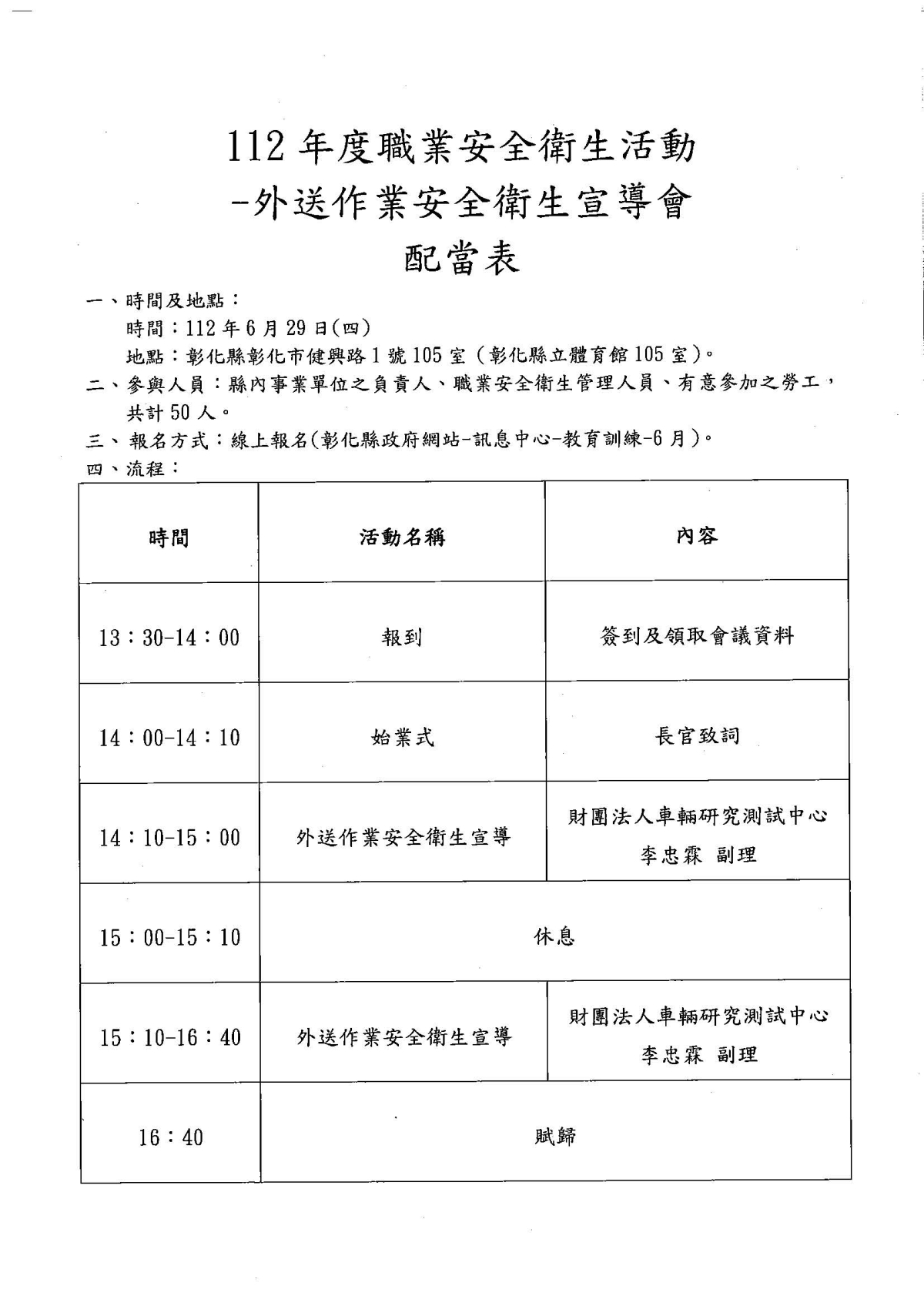 為建立外送員安全預防措施及防禦駕駛觀念,彰化縣政府辦理「112年度職業安全衛生活動-外送作業安全衛生宣導會」,敬請參訓。